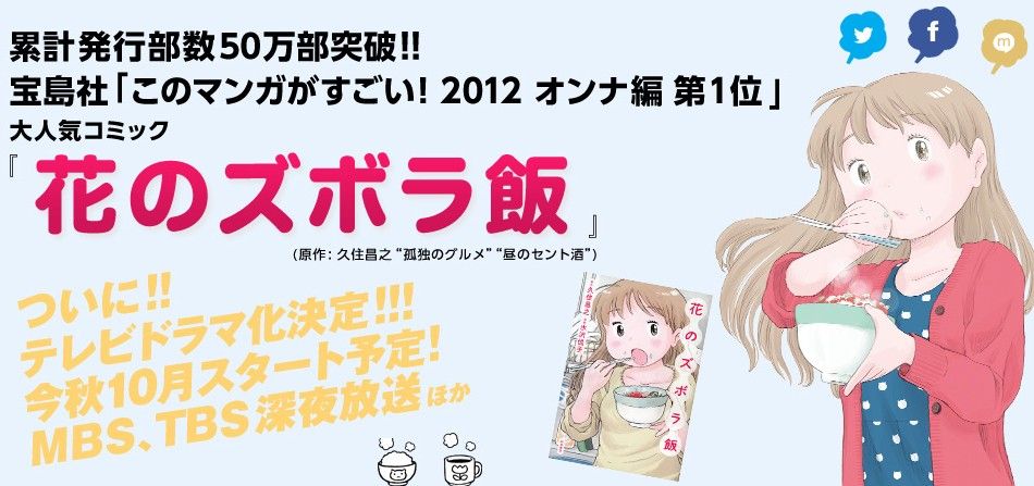 久住昌之原作による水沢悦子「花のズボラ飯」のTVドラマ化が決定した。今年10月からMBS、TBSの深夜枠にて放送される。