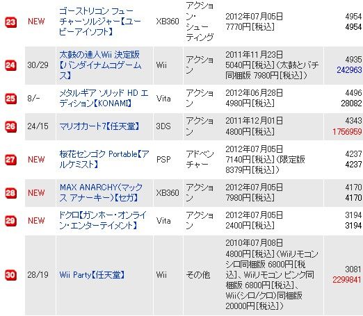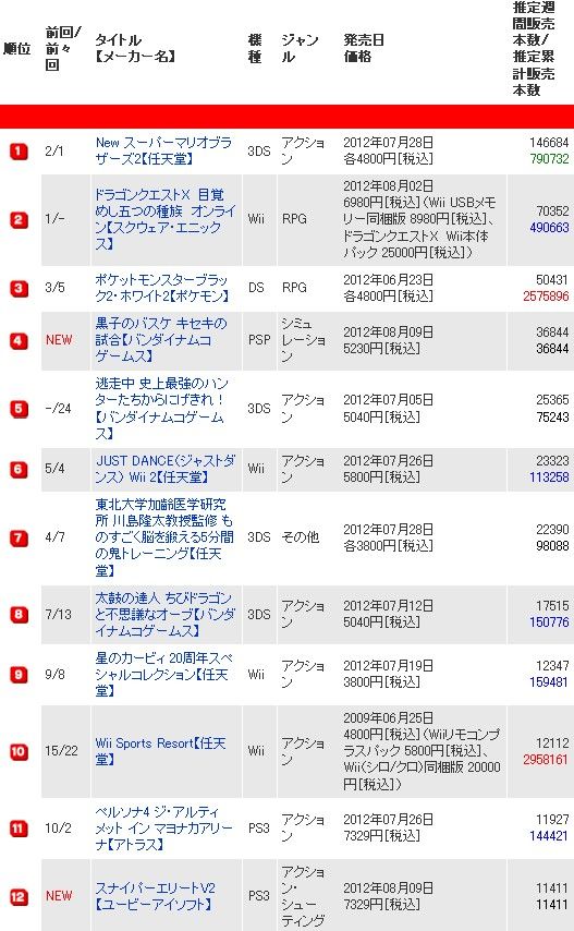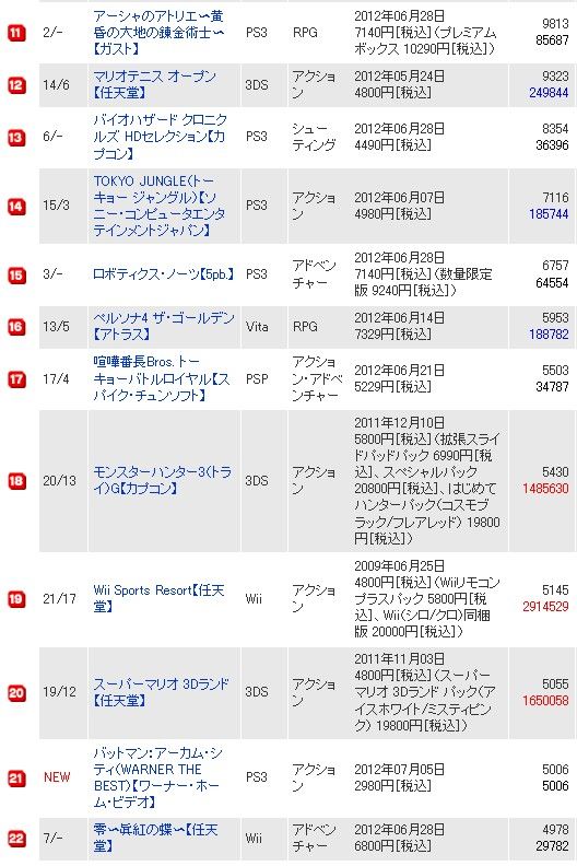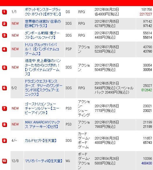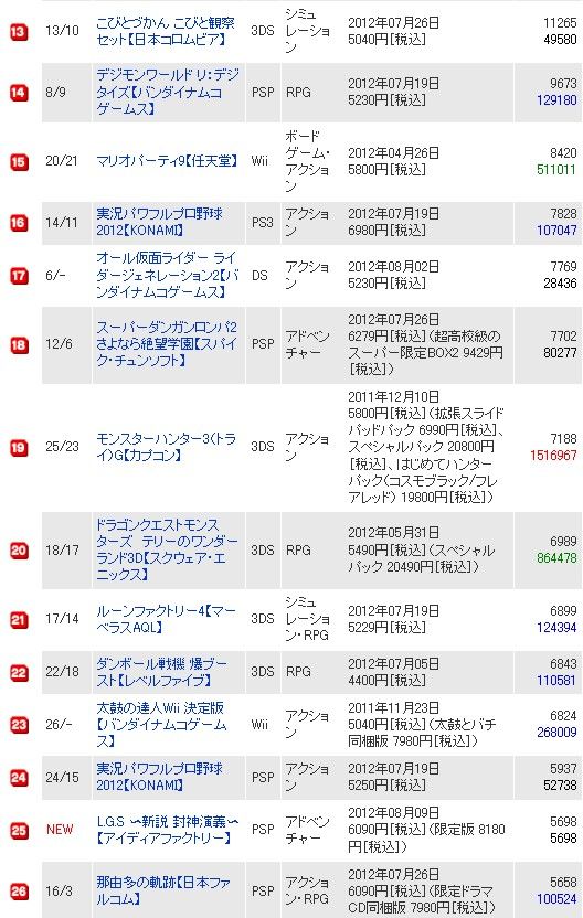 【ゲームソフト販売本数ランキング TOP30】集計期間:2012年07月02日~2012年07月08日http://www.famitsu.com/news/201207/11017826.html