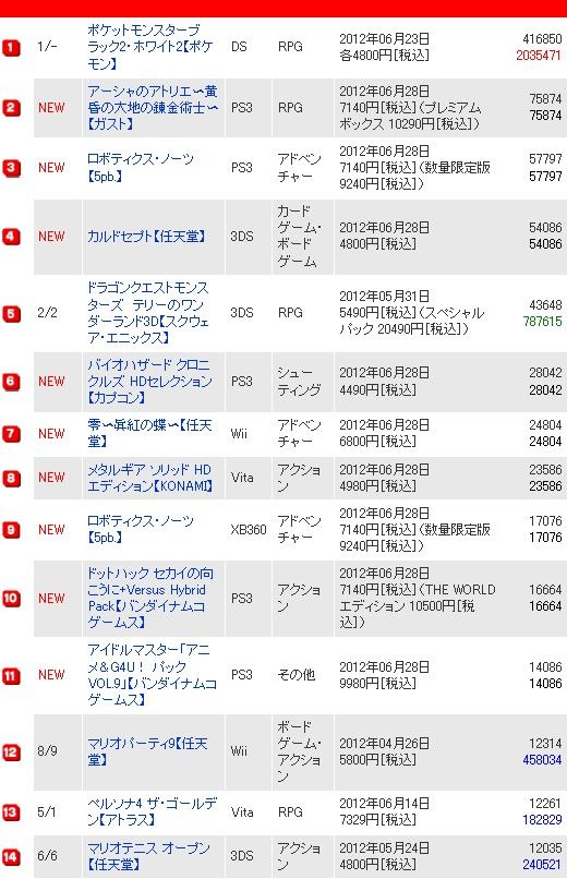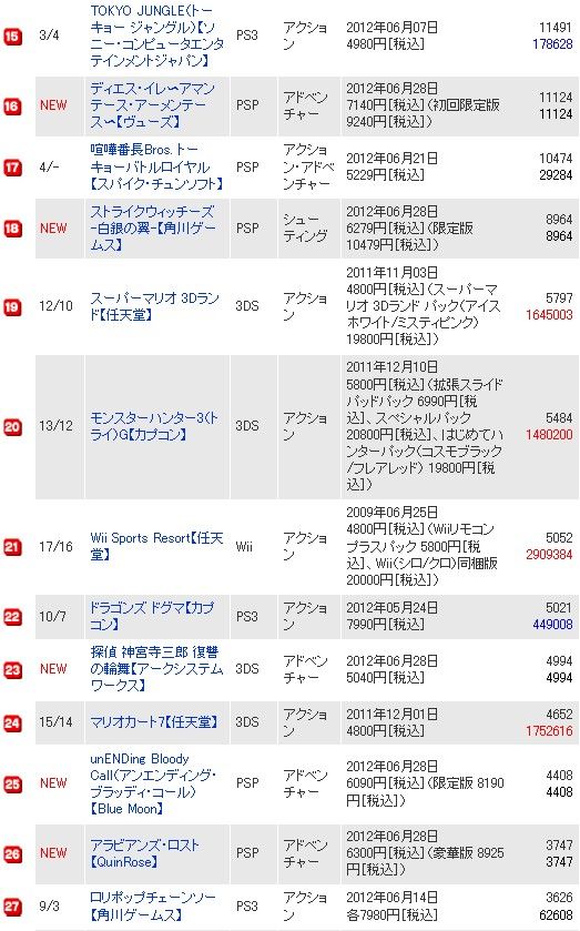 【ゲームソフト販売本数ランキング TOP30】集計期間:2012年06月25日~2012年07月01日